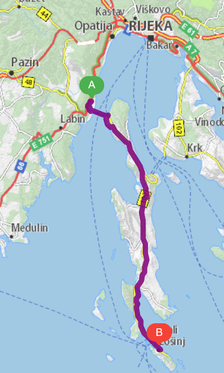 Arrival by the Krk bridge and the Valbiska-Merag ferry line